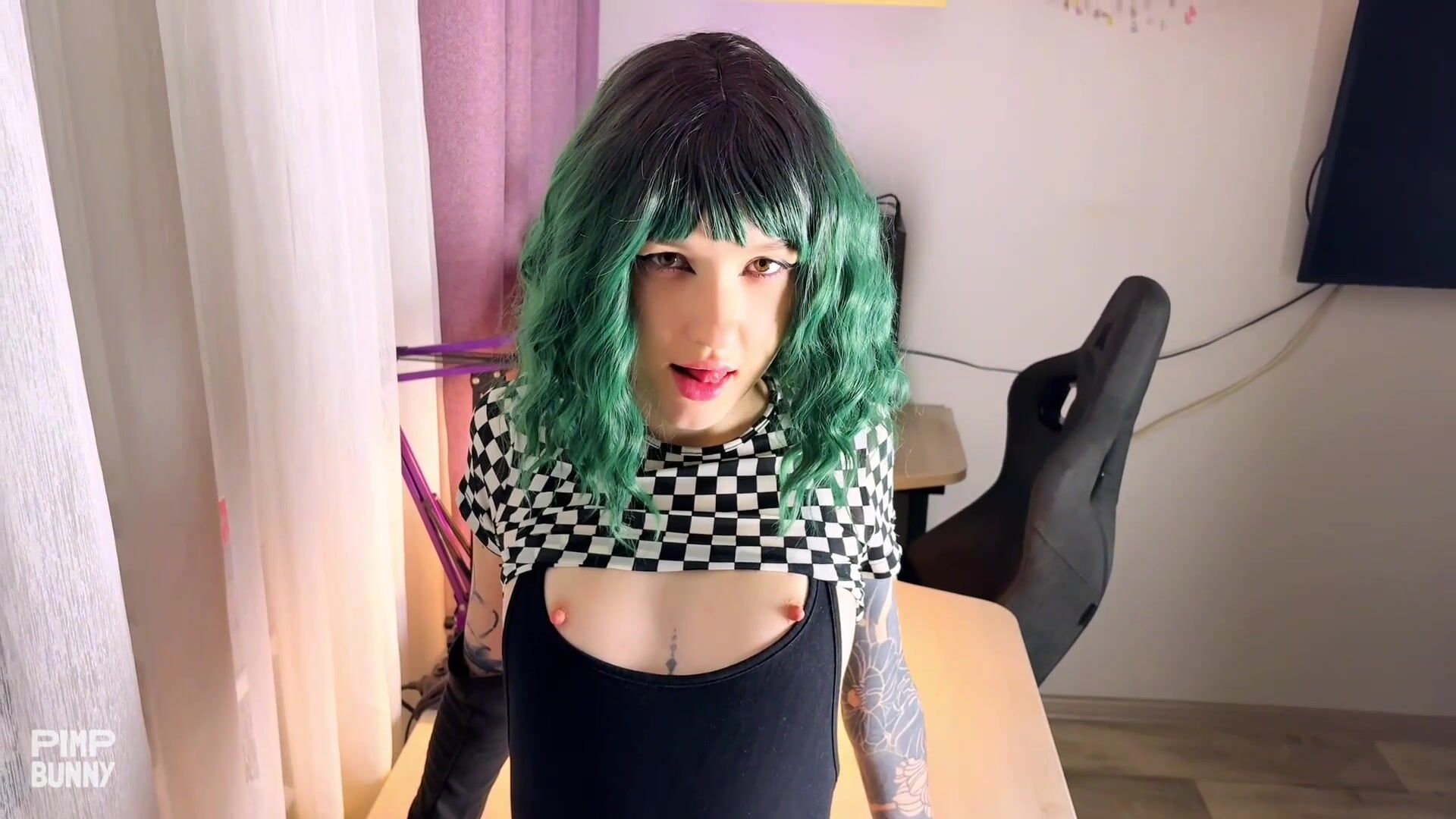 The stunning tattooed e-girl Sunako brings her wild alt-babe energy to this explosive gaming room encounter. Dressed in a provocative checkered crop top and ripped stockings, the petite brunette (with vibrant green hair) starts the night with an eye-watering POV deepthroat. The action intensifies on the desk as she gets absolutely drilled in multiple hardcore positions, from intense doggy style to deep missionary thrusts. Captured in crystal-clear high definition, every passionate moment of Sunako's performance showcases her incredible ink, skinny frame, and wild energy. Experience the ultimate e-girl fantasy right here!